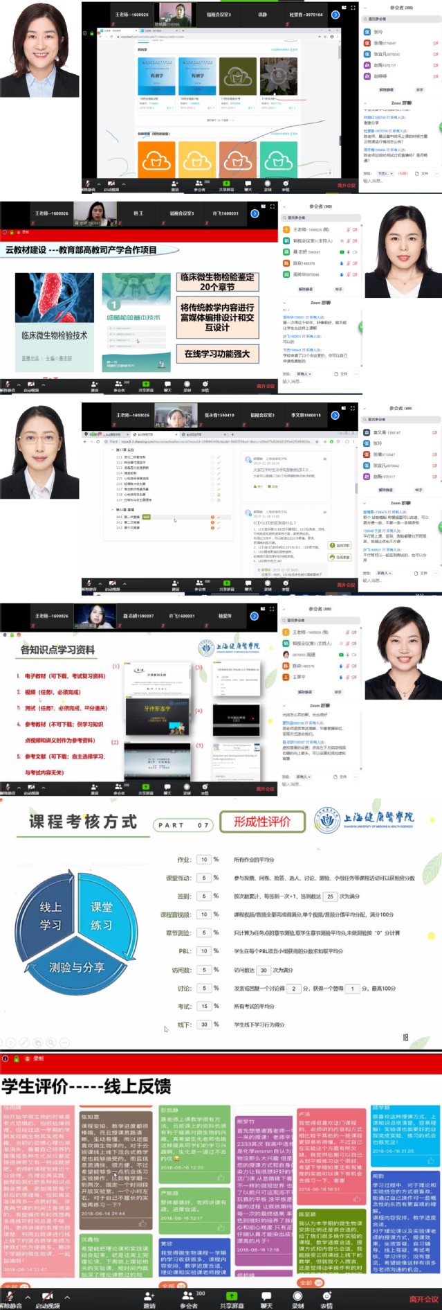 直播活动由我校4位具有丰富在线教学和混合式教学经验,并且在上海市优质在线课程建设、全国微课比赛、FD-QM认证与评审等方面取得丰硕成果的优秀青年教师担任主讲。药学院陈晓晶老师和医疗器械学院王艳老师分别以“基于云班课的《药剂学》在线教学实施”和“《单片机应用技术》课程制作和在线维护”为题,着重结合个人的教学实践,在线分享和直观展示蓝墨云班课和超星平台的各种功能;医学技术学院聂志妍老师和周璟老师则以“《微生物检验技术》在线课程建设和混合式教学探索”和“《牙体形态学》课程在线教学实践的初步探索”为题,着重从“教学目标、教学模式、教学安排与进度、单元设计、学习资源及考核评价方式”方面,对如何借助智慧树、超星、ZOOM等平台进行了混合式教学的“说课程”。